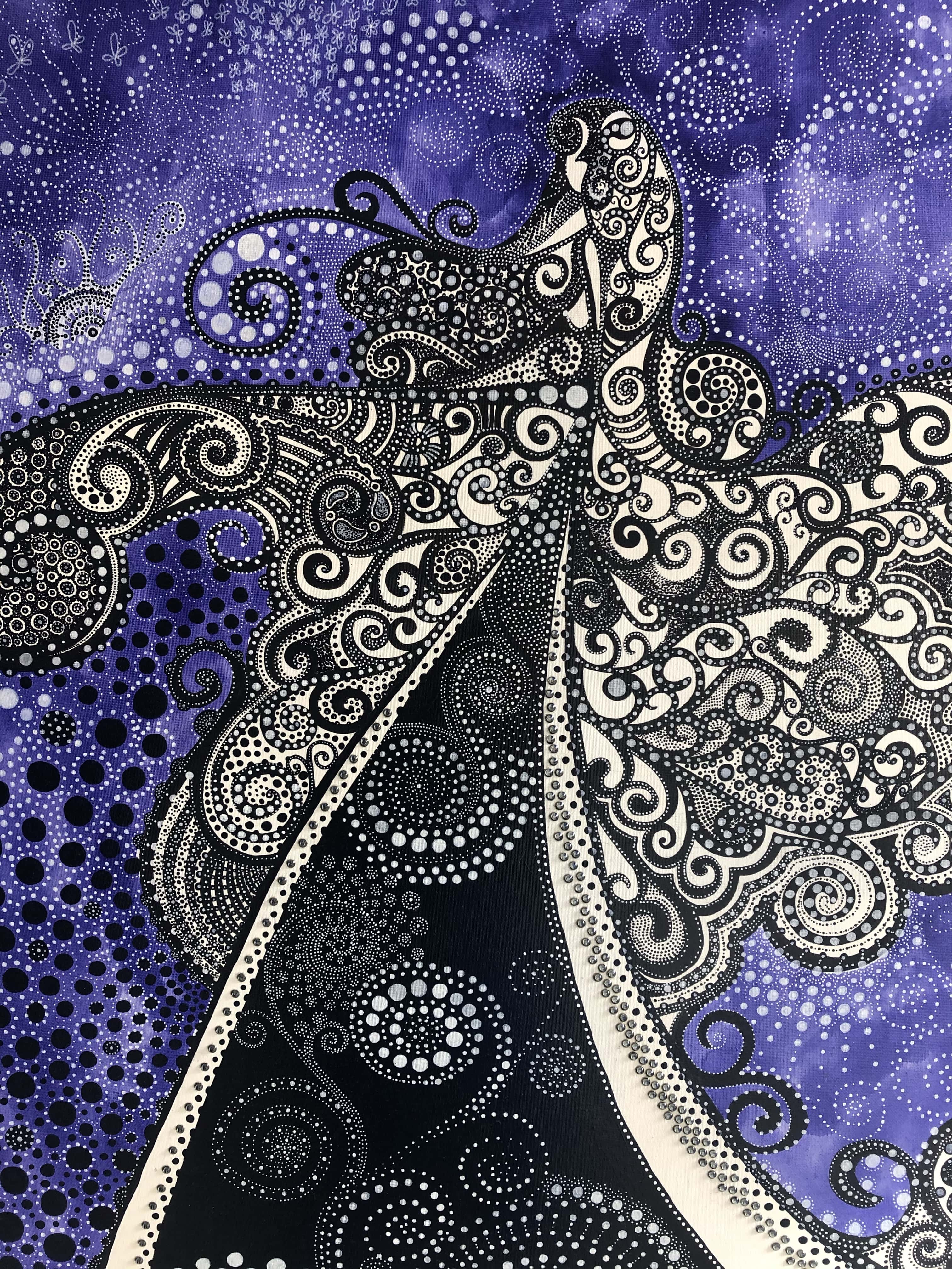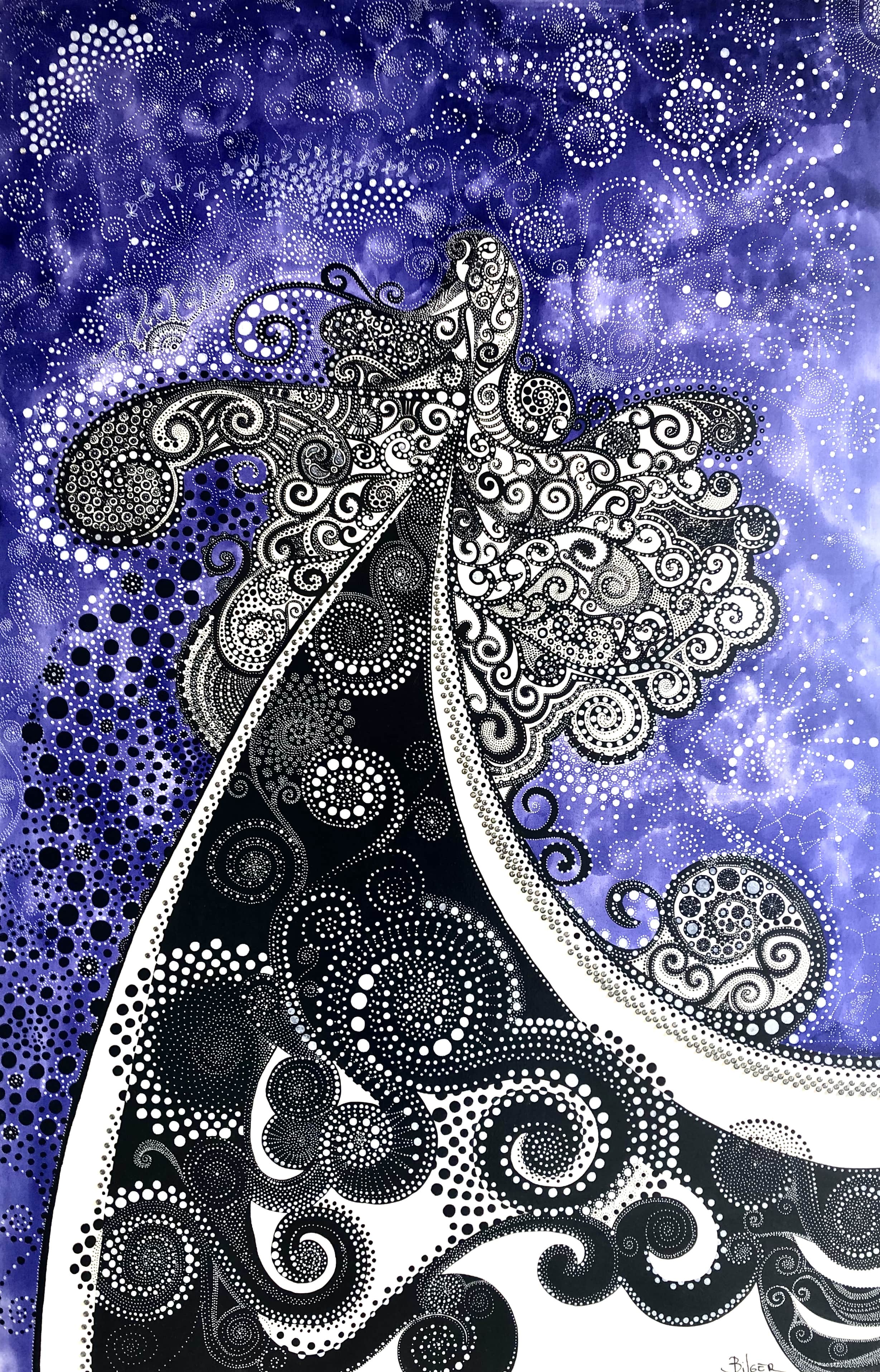 "Petite demoiselle", 2015. Disponible: prix sur demande, 65X100cm. Comme un mannequin sur le podium parée de ses plus beaux effets. Encre acrylique, encre de chine, feutres peintures sur toile.