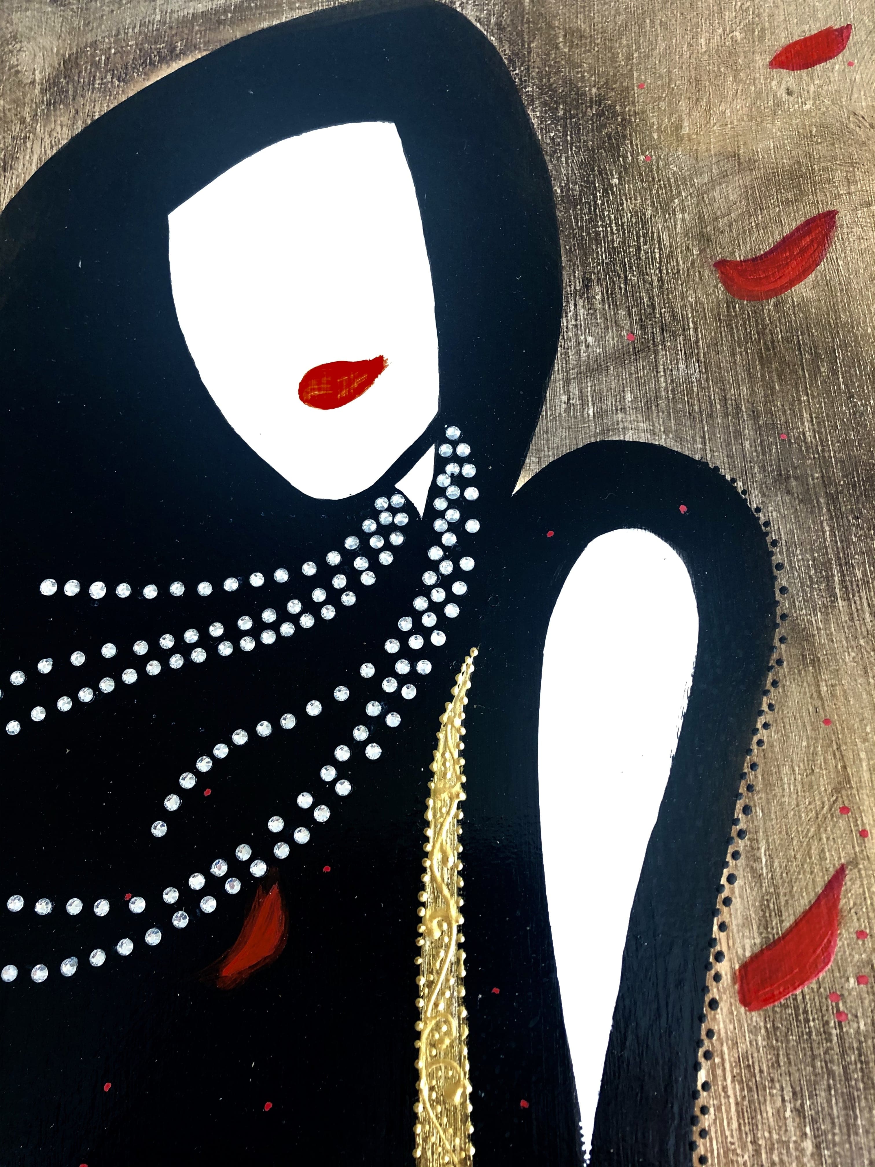 Disponible: prix sur demande, 100X130cm. Très grande toile pour une petite demoiselle, n'hésitez pas a zoomer dessus pour voir tous les détails. Acrylique, encre de chine, feuilles miroir dorées sur toile.