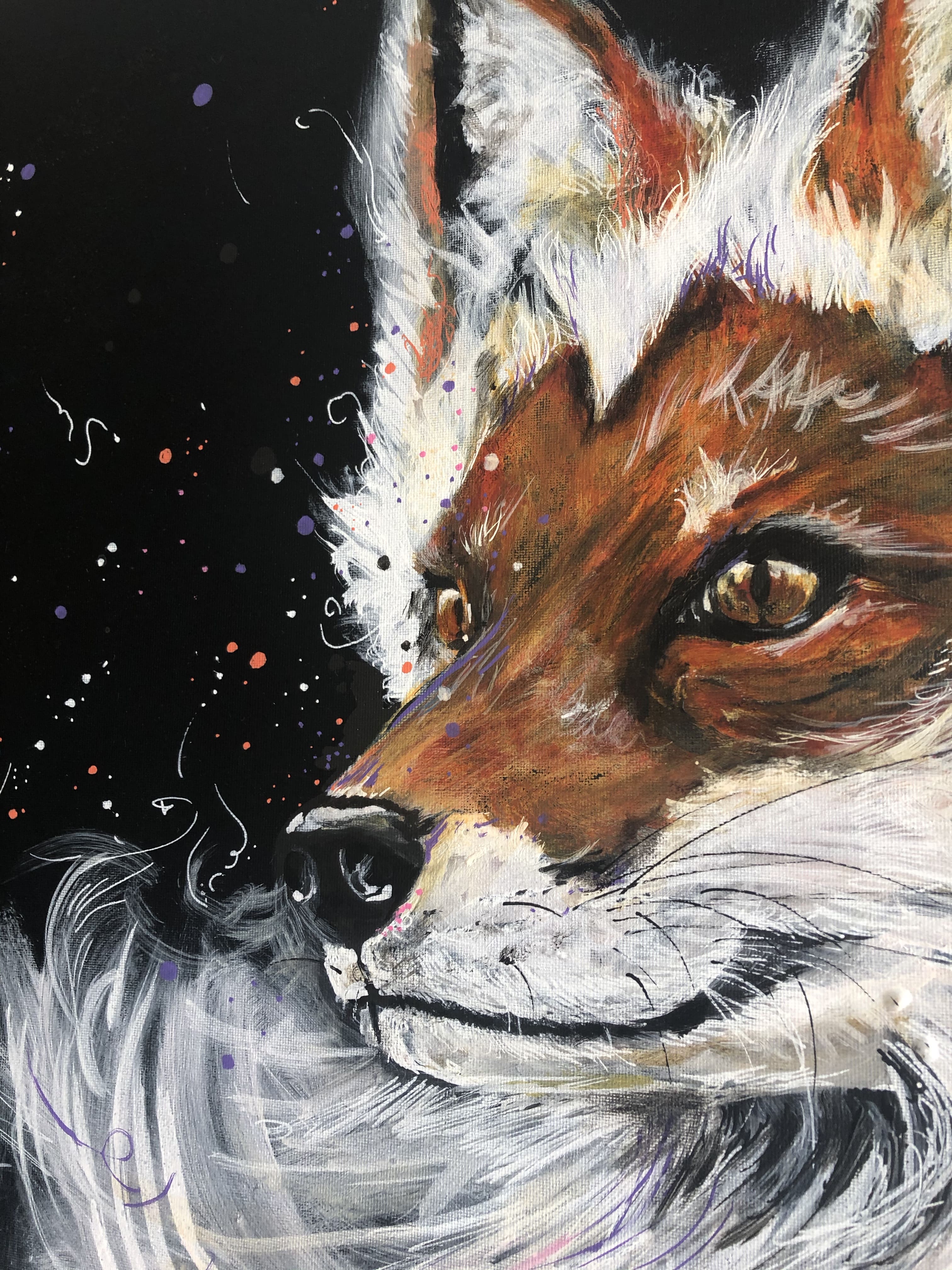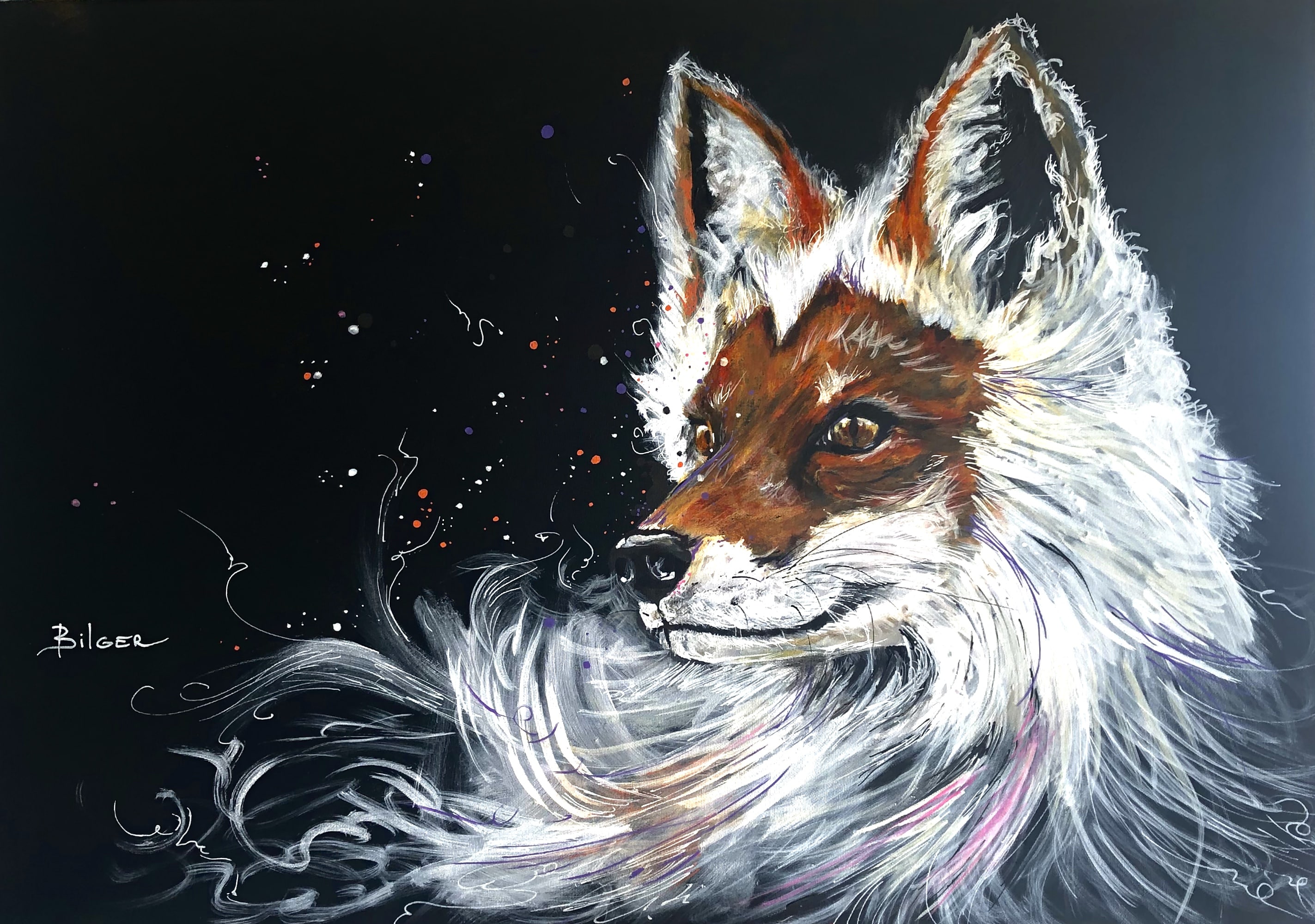 "FOX", 2020. Disponible: 350 euros, 46X65cm, sa fausse réputation nous fait oublier son élégance et sa beauté. Encre acrylique, acrylique, encre de chine, feutres peinture sur toile de lin.