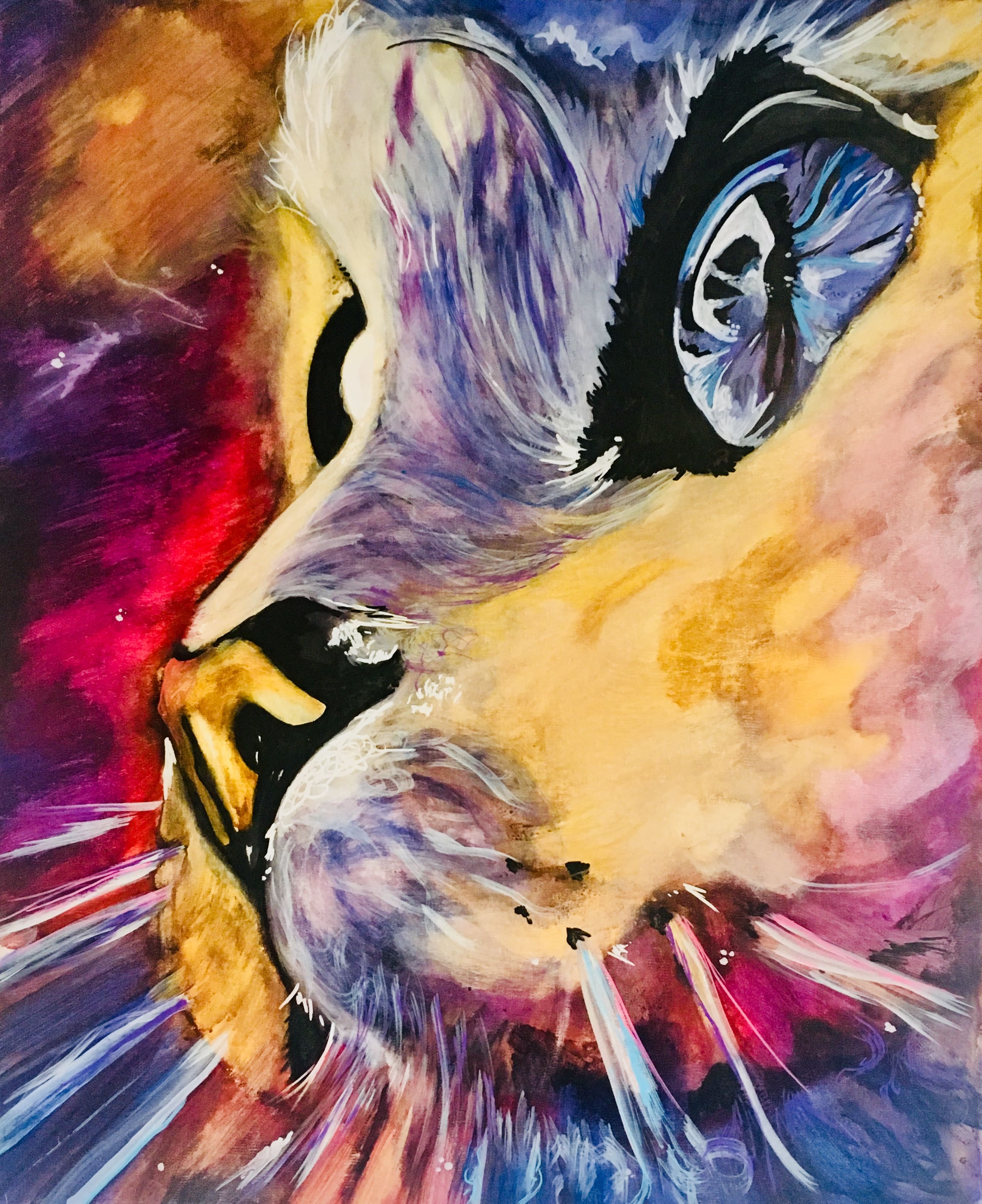 "Chat", 2020. Disponible: encre acrylique, feutre peinture, 50X61cm. Il est l'un de nos compagnons de route. Encre acrylique, acrylique, encre de chine, feutres peinture sur toile de lin.