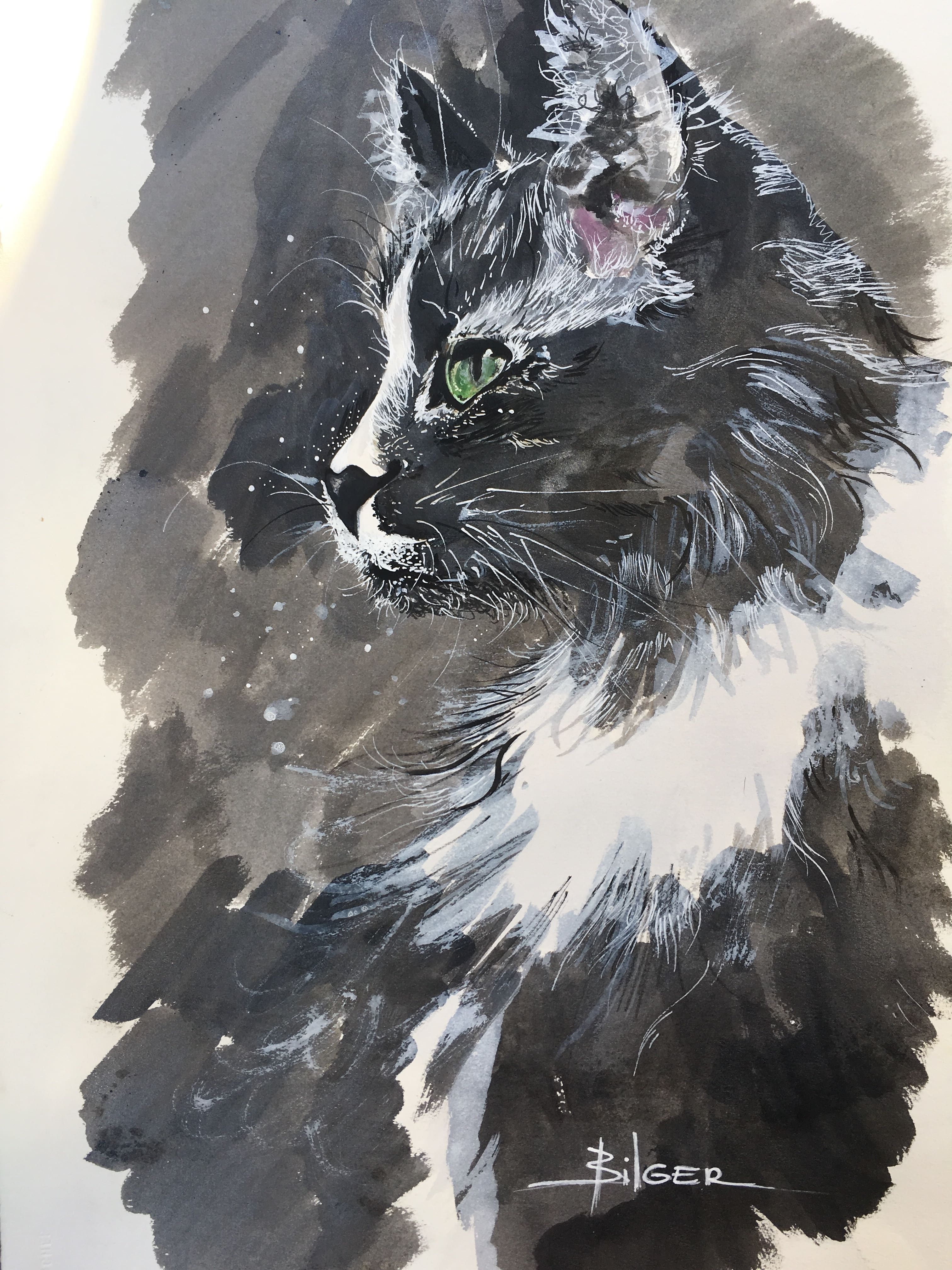 "CHAT", 2020. Disponible, 40X60cm. Aquarelle, encre acrylique, encre de chine sur papier dessin. Il est l'un de nos plus proche compagnon de route.