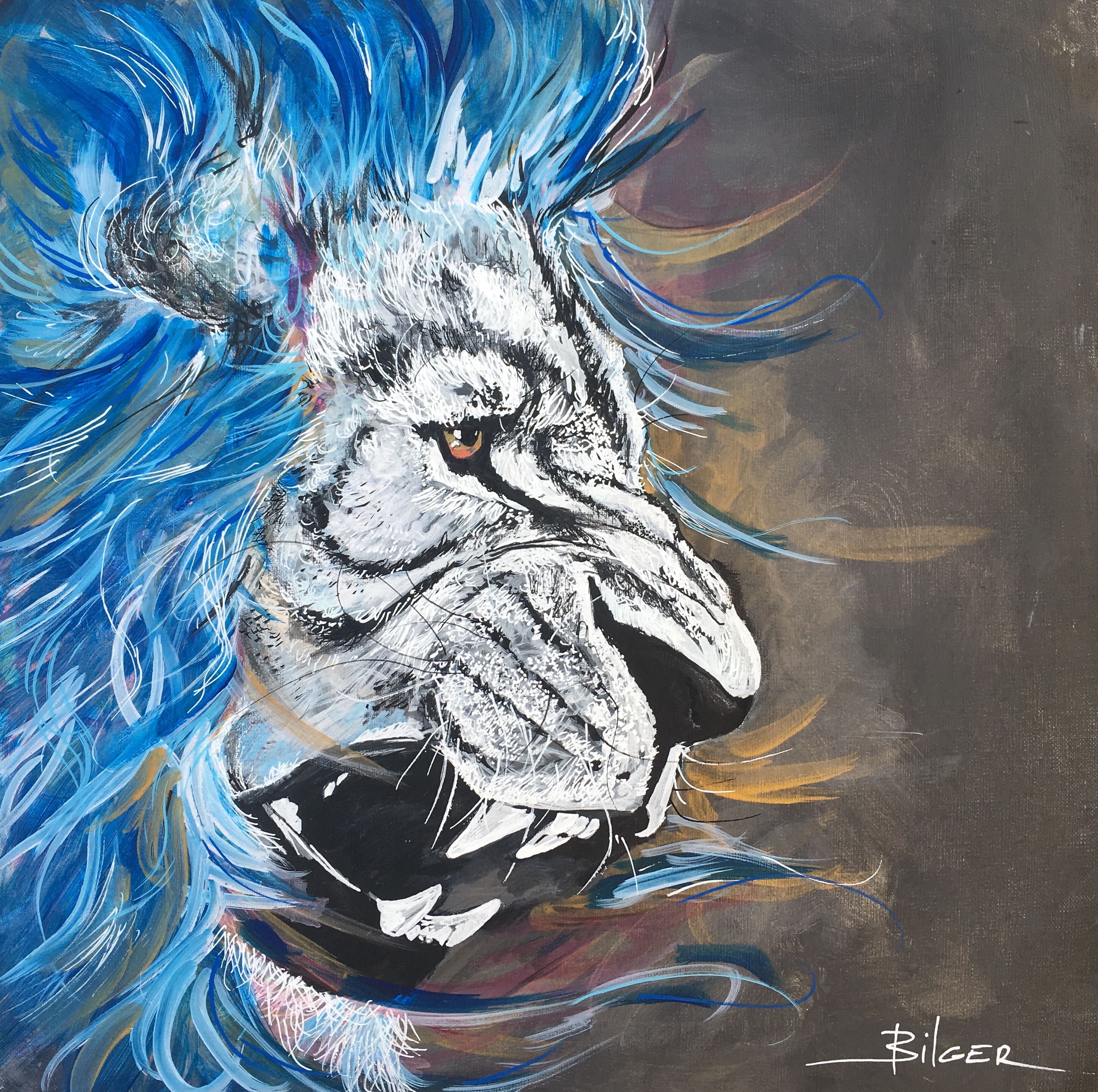 "KING", 2020. Disponible: 250 euros, 40x40cm. Acrylique, encre acrylique, feutre peinture sur toile de lin. Plusieurs de mes tableaux représentant un lion s'appellent "KING" mais comment l'appeler autrement?.